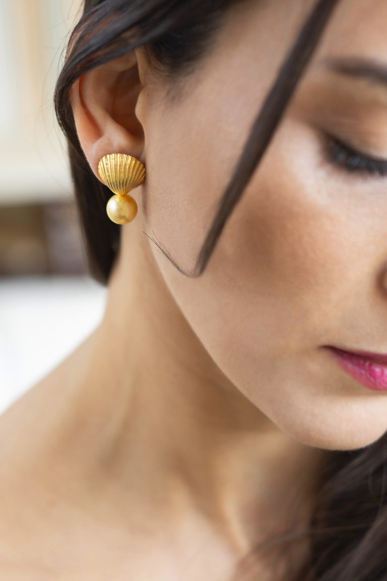 925 Ayar Gümüş, 18 Ayar Altın Kaplama, İstiridye Motifli, Sarı Mayorka İncili, Gümüş Küpe.